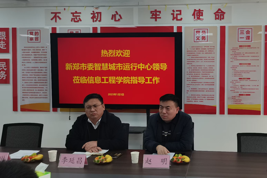 2025年1月3日,新郑市委智慧城市运行中心领导一行莅临信息工程学院,就如何更好地开展校政合作进行深入指导与交流。此次会议旨在深化校政双方合作,推动智慧城市建设和信息技术创新发展。