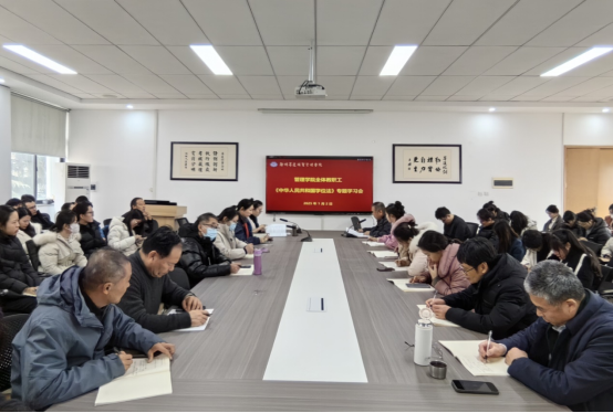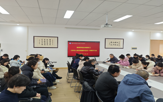 为认真贯彻落实《中华人民共和国学位法,1月2日下午,我院在教学二号楼209会议室召开全体教职工《中华人民共和国学位法》专题学习会,本学院领导班子、学位评定委员会全体委员以及全体教职工共同参与,会议由教学秘书刘锦主持。