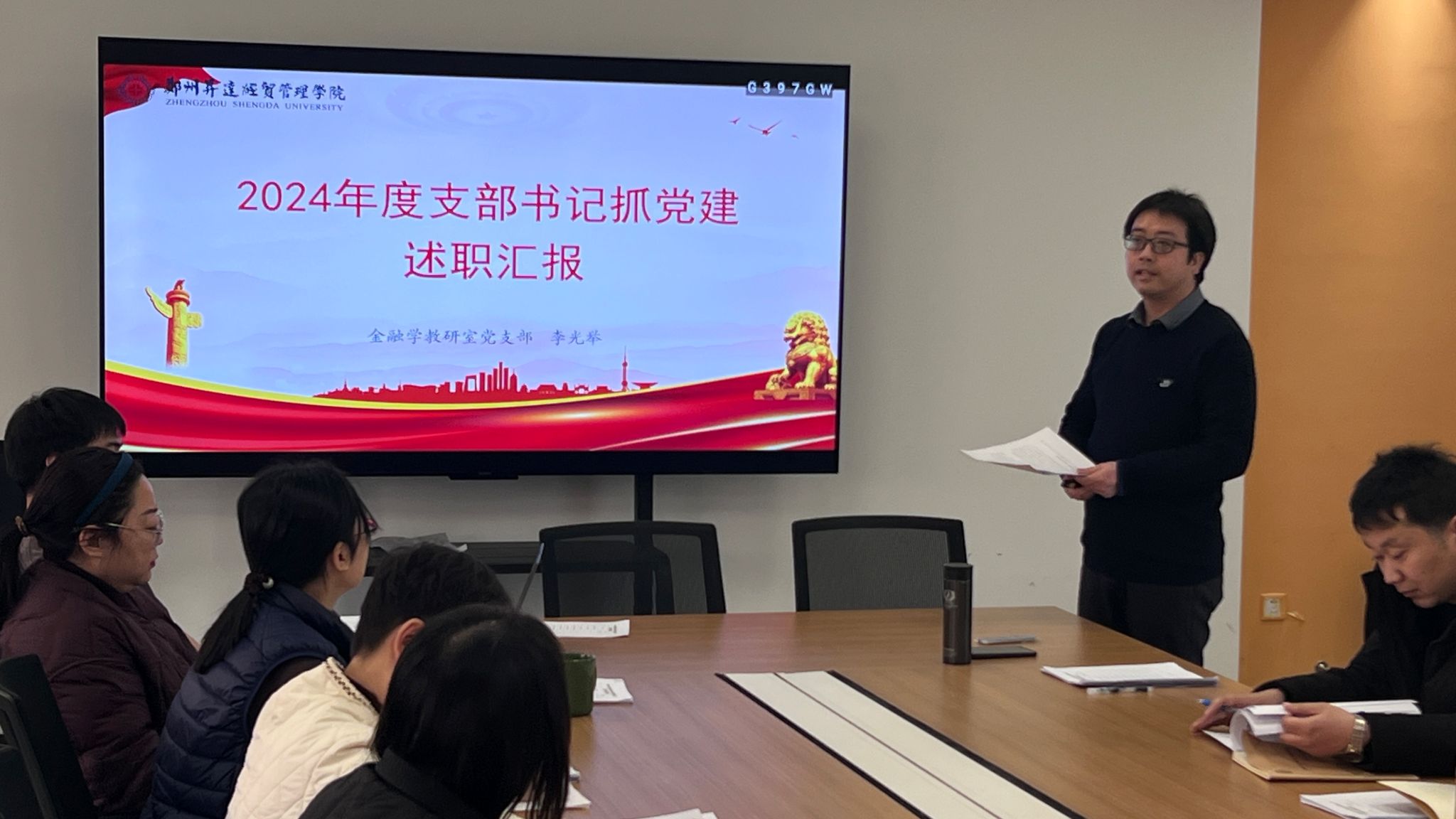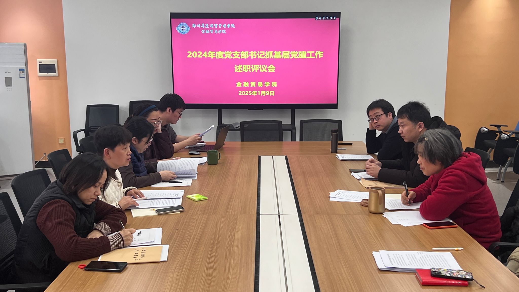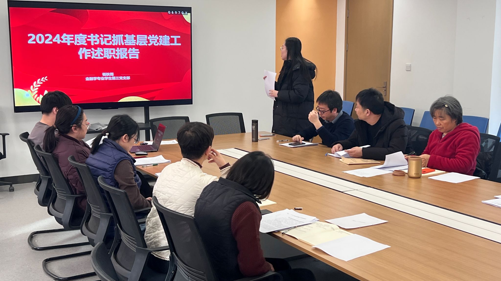 2025年1月9日,金融贸易学院在三号楼212会议室召开2024年抓基层党建工作述职评议会,会议由党委委员王娟主持,院党委书记钟江鸽、院党委委员、各党支部书记、师生党员代表参加。