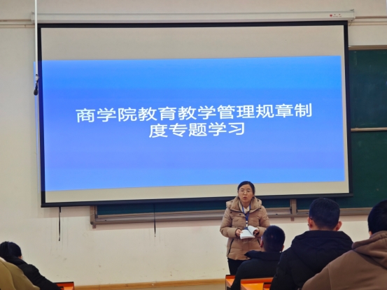 2月20日下午14:30,商学院在教学楼2号楼116教室召开教育教学管理规章制度专题学习会议,院长白朋飞、党委书记郭峰、教学秘书马巧丽、行政秘书郗艳花及全体教职工参加了此次活动。