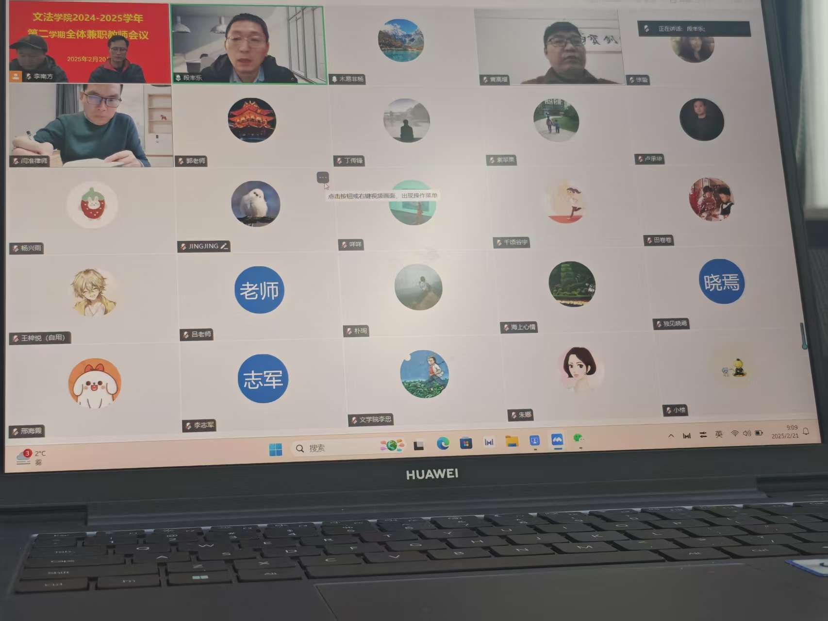 2月21日上午,文法学院通过腾讯会议平台召开2024-2025学年第二学期全体兼职教师会议,参加会议的有院长段丰乐、副院长赵严俊,教学秘书李南方和全体兼职教师。