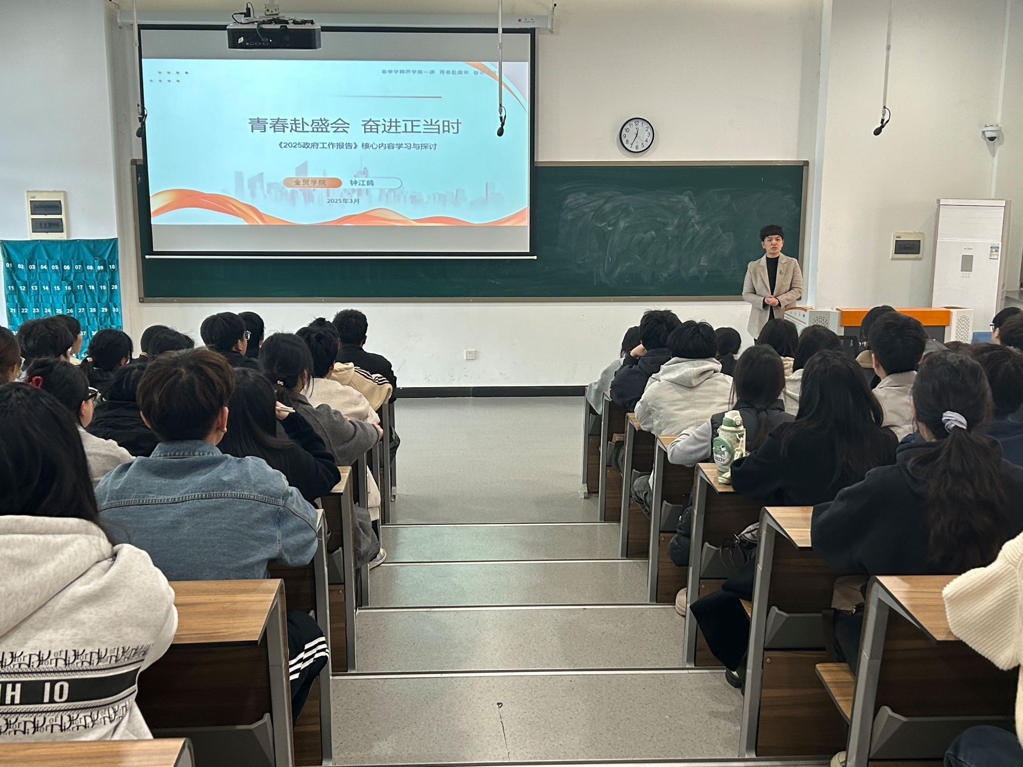 3月13日,金融贸易学院党委书记钟江鸽在3号楼210室讲授2025年春季学期“开学第一课”。本次授课旨在引导学生深刻领会两会精神,切实增强青年学子的政治责任感和历史使命感。
