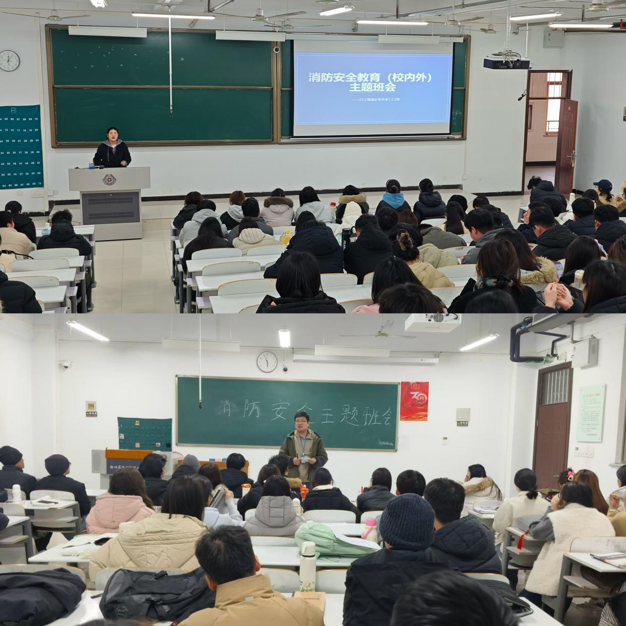 班会内容紧密围绕学生生活场景与实习需求展开。针对校内学生,各班级通过播放校园火灾警示片、演示灭火器使用步骤等形式,系统普及火灾预防、初期扑救及逃生自救知识。辅导员现场讲解宿舍用电安全规范,强调禁止使用大功率电器、禁止私拉乱接电线等具体要求,并组织学生观看模拟火灾发生时的应急疏散流程。