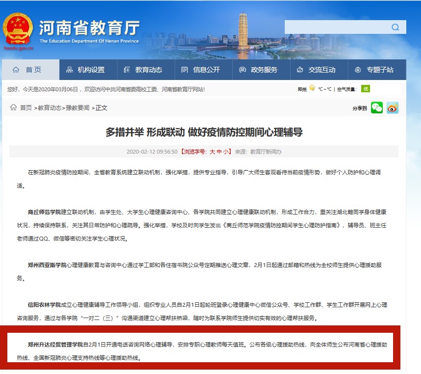 2020年2月12日,河南省教育厅官方网站豫教要闻栏目发布题为《多措并举 形成联动 做好疫情防控期间心理辅导》的综合文章一篇,介绍在新冠肺炎疫情防控期间,全省教育系统如何建立联动机制,强化举措,提供专业指导,引导广大师生客观看待当前疫情形势,做好个人防护和心理调适。其中报道了我校在该项工作中的典型做法。现将原文摘录如下: