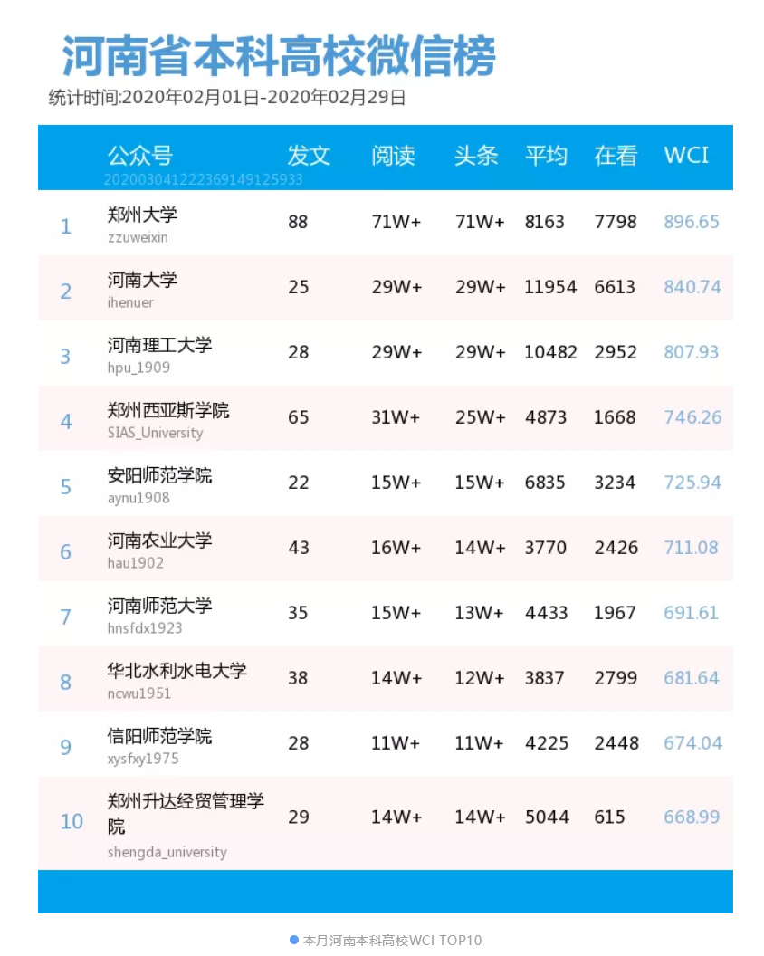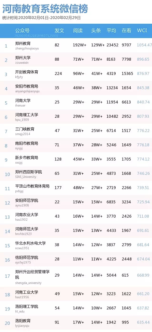 近年来,“两微”账号在政务和高校新媒体传播格局中所占地位越来越高,教育系统“两微”工作成了宣传主流价值和拓宽传播渠道的重要途径。2020年3月5日,河南省教育新媒体暨舆情研究中心采用第三方平台(清博指数)监测到的数据,对2月01日—2月29日期间河南省教育系统微信综合传播力进行排名并整理发布于河南省教育厅官方微信公众号题为《河南省教育系统2月“两微”“琅琊榜”来了!看看“十强”都是谁?》的推文中。