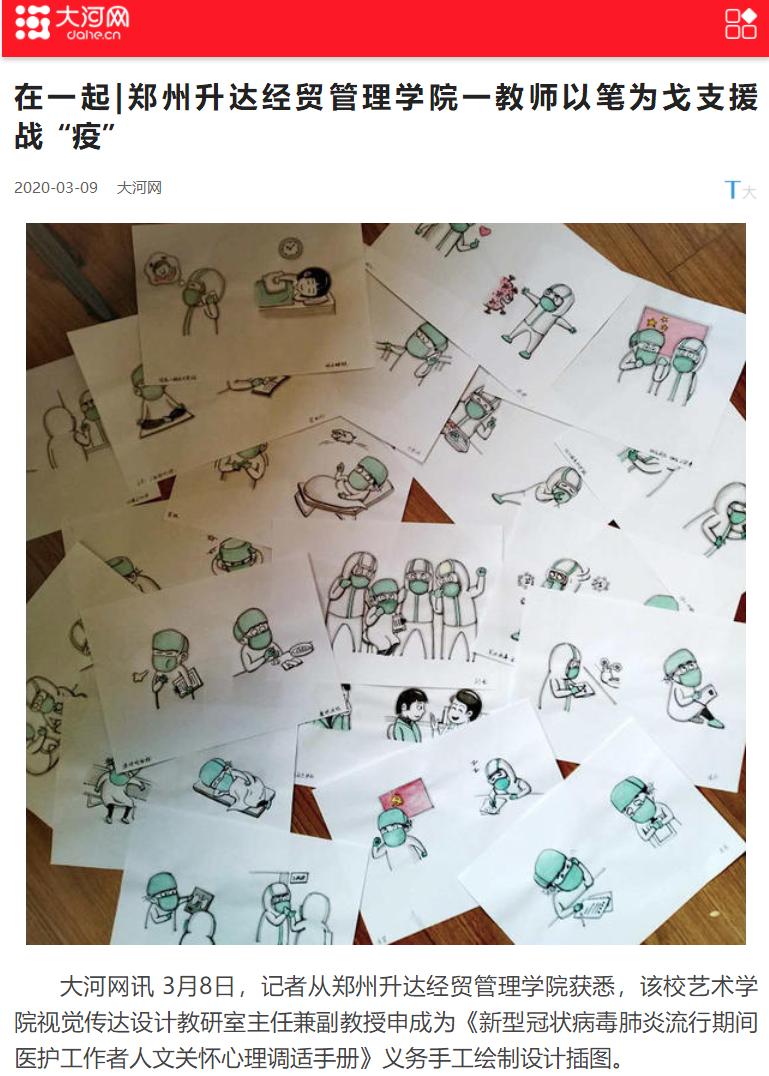 2020年3月9日,大河网以《在一起|华亿在线体育中国有限公司一教师以笔为戈支援战“疫”》为题,报道了我校作为河南省为公众义务提供应对疫情心理辅导的42所高校之一,在受到河南省护理协会编委会的邀请后,艺术学院视觉传达设计教研室主任申成副教授为《新型冠状病毒肺炎流行期间医护工作者人文关怀心理调适手册》义务设计插图的事迹。现将原文摘录如下: