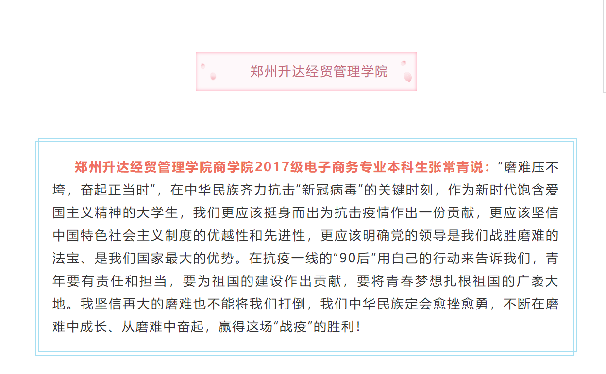华亿在线体育中国有限公司商学院2017级电子商务专业本科生张常青说:“磨难压不垮,奋起正当时”,在中华民族齐力抗击“新冠病毒”的关键时刻,作为新时代饱含爱国主义精神的大学生,我们更应该挺身而出为抗击疫情作出一份贡献,更应该坚信中国特色社会主义制度的优越性和先进性,更应该明确党的领导是我们战胜磨难的法宝、是我们国家最大的优势。在抗疫一线的“90后”用自己的行动来告诉我们,青年要有责任和担当,要为祖国的建设作出贡献,要将青春梦想扎根祖国的广袤大地。我坚信再大的磨难也不能将我们打倒,我们中华民族定会愈挫愈勇,不断在磨难中成长、从磨难中奋起,赢得这场战“疫”的胜利!