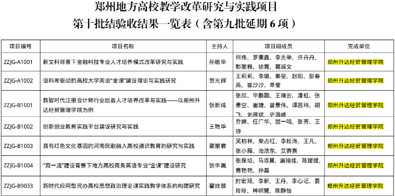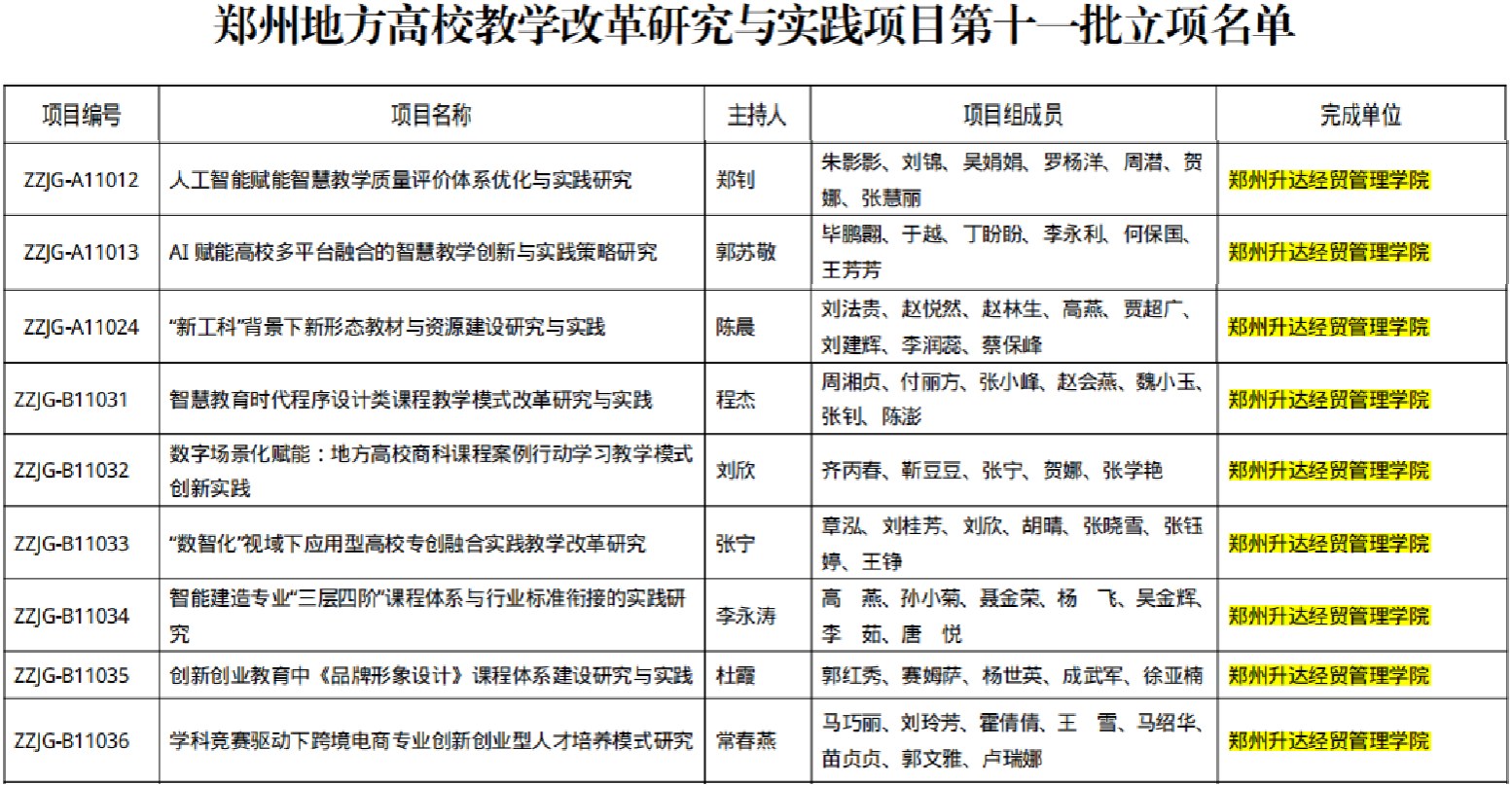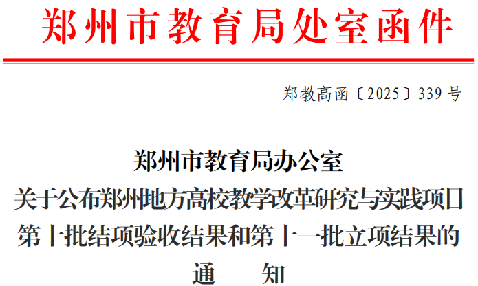 近日,郑州市教育局发布《关于公布郑州地方高校教学改革研究与实践项目第十批结项验收结果和第十一批立项结果的通知》(郑教高函〔2025〕339号),我校郑钊等老师的9个项目获“郑州地方高校教学改革研究与实践项目第十一批立项”,其中包含3项重点项目。同时我校孙植华等老师的7个项目顺利通过“郑州地方高校教学改革研究与实践项目第十批结项评审”。