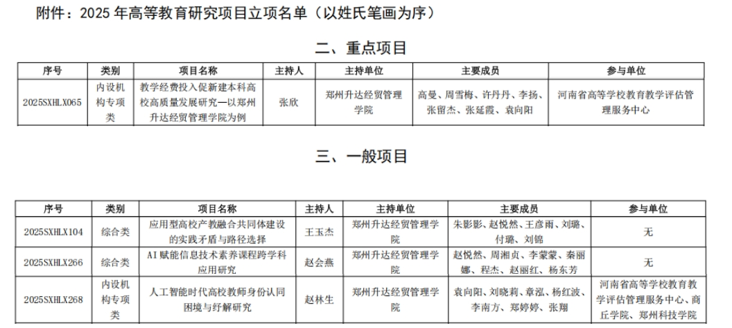 根据河南省高等教育学会下发《关于公布2025年河南省高等教育研究项目立项名单的通知》(豫高教学会〔2025〕28号)文件,我校作为主持单位有4项课题获批立项,其中重点项目1项,一般项目3项。