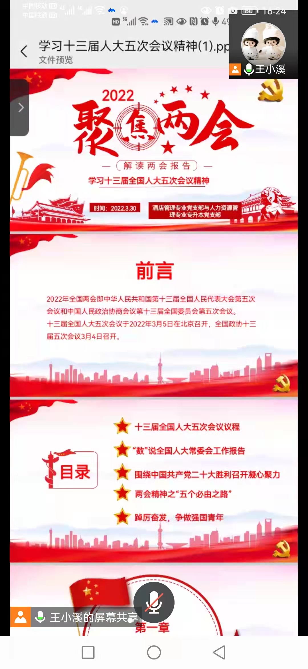 3月30日管理学院酒店管理专业党支部与人力资源管理专业专升本党支部通过线上腾讯会议开展“学习十三届人大五中会议精神”主题党日活动。本次活动由人力资源管理专业专升本党支部支部书记王陪陪同志进行主持。