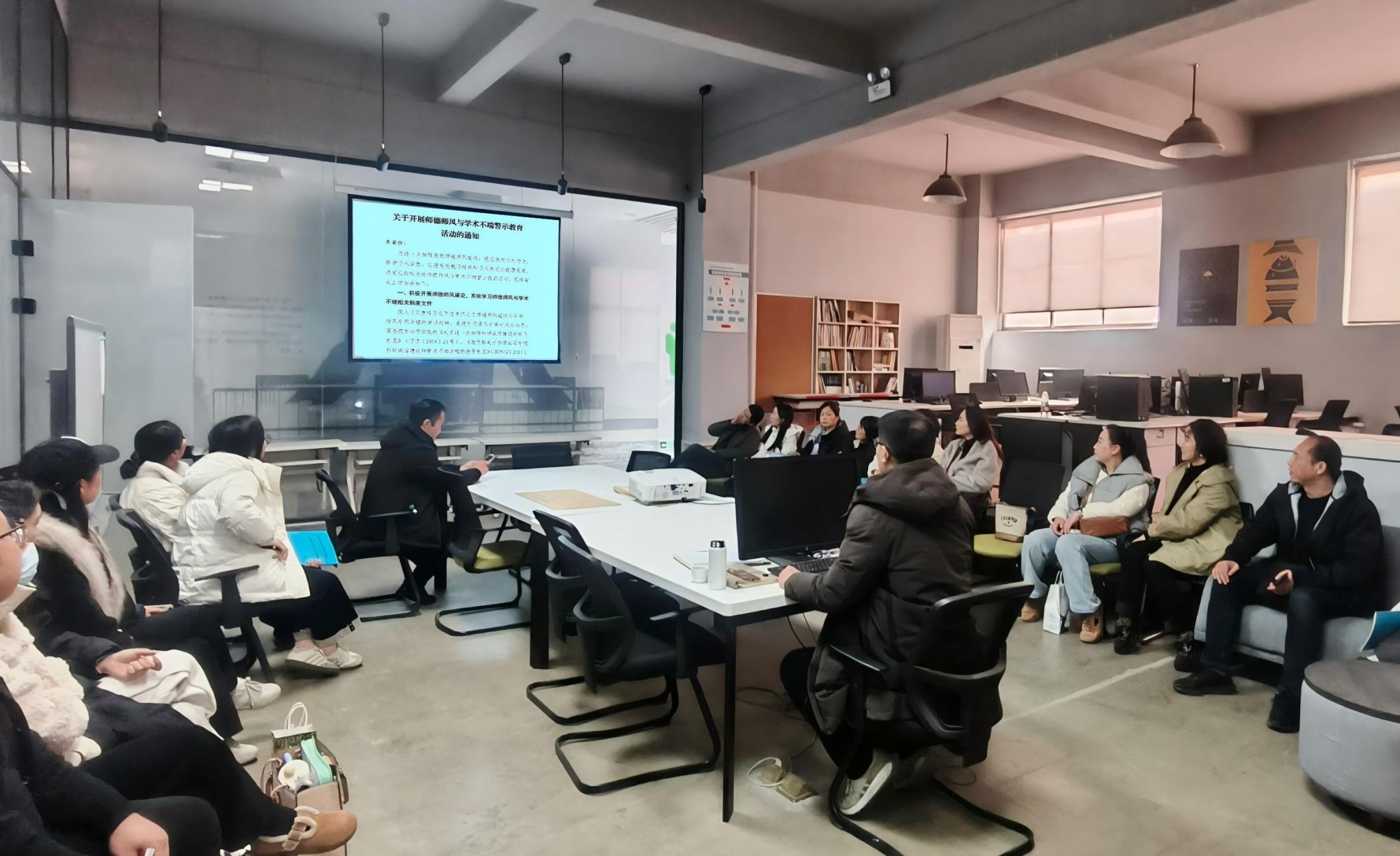 为深入落实学校关于师德师风与学术不端警示教育的通知要求,强化教研室师德建设,规范学术行为,涵养优良学风,12月12日13:00,艺术学院环境设计教研室在艺术楼205组织开展专题警示教育活动,由教研室主任姜新宇主持,全体教师参加。