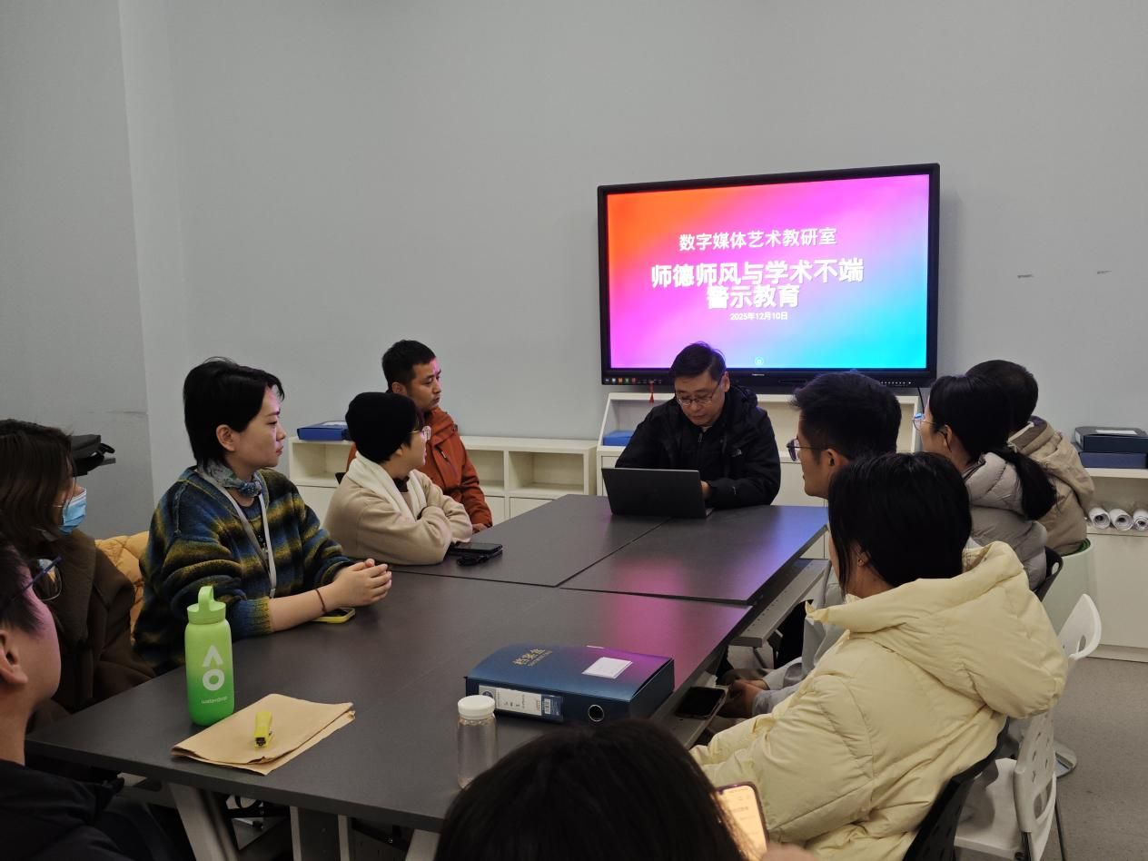 2025年12月11日,数字媒体艺术教研室于艺术楼 204教室召开师德师风与学术不端警示教育会。会议由教研室主任杨世英主持,专业全体教师参会。会议旨在强化师德师风建设,明确学术行为规范,防范学术不端,引导教师坚守教育初心与学术诚信,助力专业教学科研良性发展。