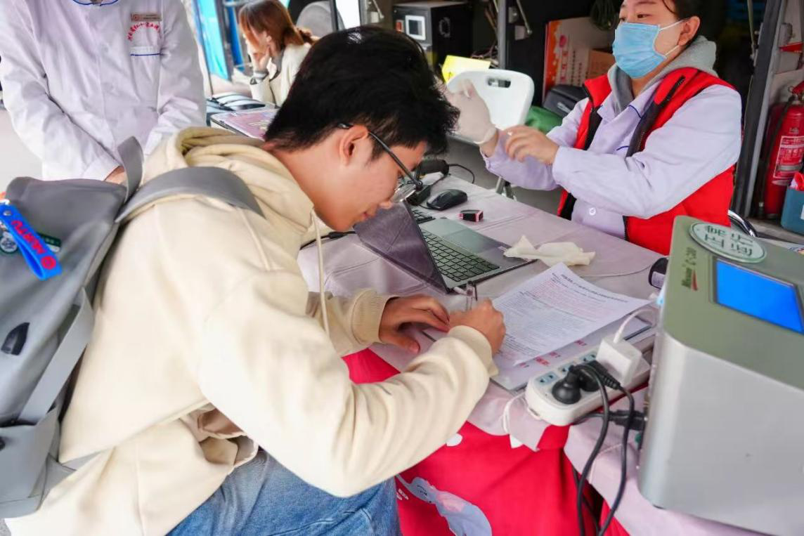 献血活动期间,每位前来献血的师生携带身份证至接待区,在志愿者的协助下完成基本信息登记,负责献血前检查的医护人员再次核对健康信息,确保献血安全。经过登记和健康血液检测之后,医护人员带领献血者前往采血区,只见他们从容挽袖,手臂舒展,医护人员专注操作——这是生命接力的温暖瞬间。献血完成后,志愿者会送上糖水并指引至休息区,同时送上登记后的《无偿献血证书》。