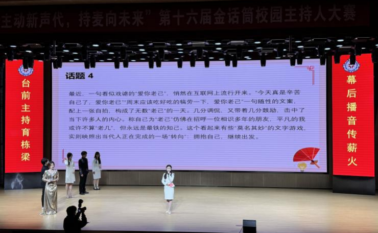 经过近两个小时的激烈角逐,大赛评选结果正式出炉,最终诞生一等奖2 名、二等奖 2 名、三等奖 3 名、优秀奖 5 名及最佳人气奖 1 名。作为我校校园文化的重要品牌活动,“金话筒” 校园主持人大赛不仅为怀揣主持梦想的学子搭建了展示自我的专业舞台,更在以赛育人的实践中,培育了一批兼具出色语言表达能力与深刻思辨素养的青年人才。