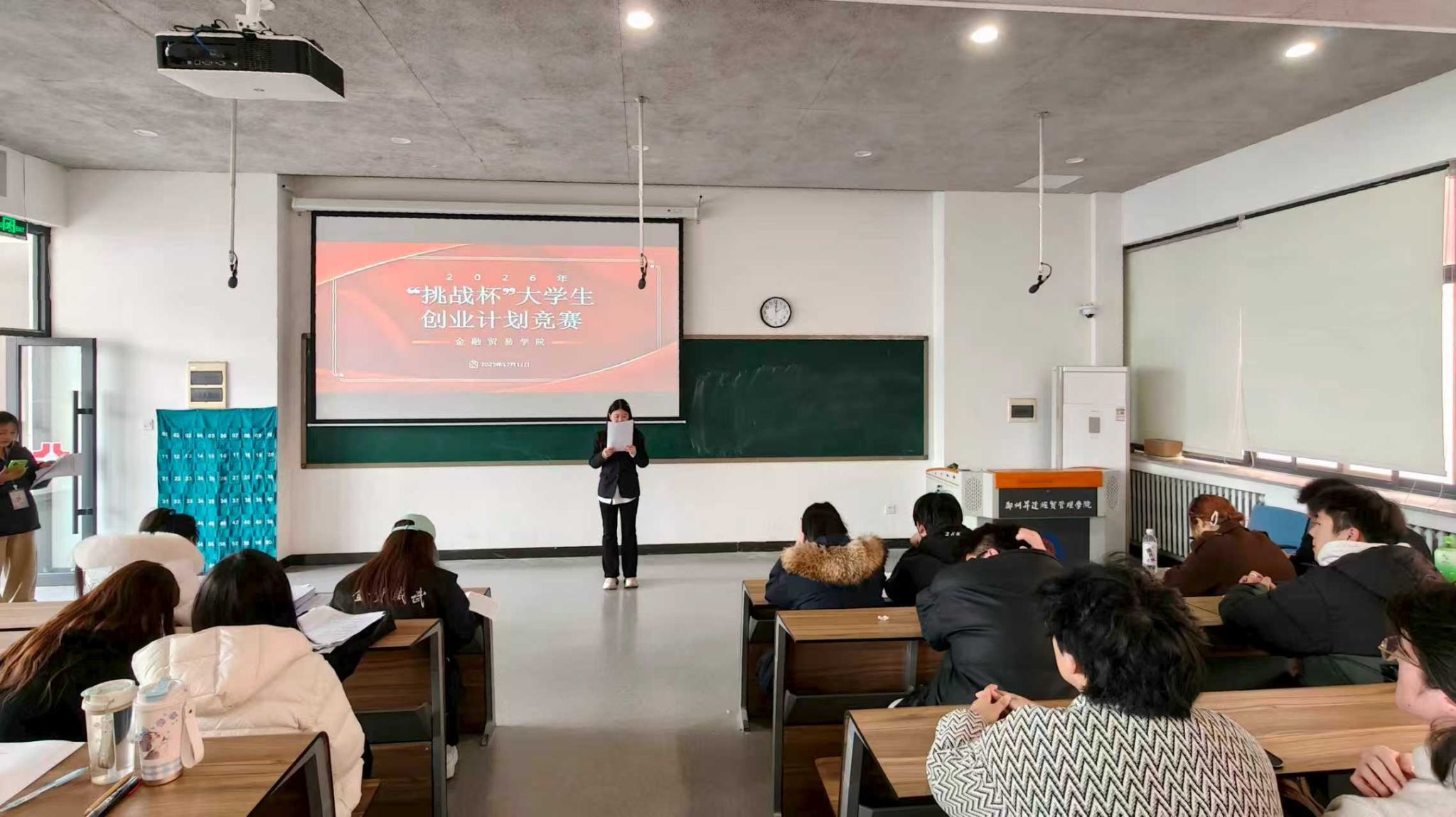 12月11日14:00,由金融贸易学院团委主办,团委学术部承办的2026年“挑战杯”大学生创业计划竞赛院赛,在教学3号楼212室举办。金融贸易学院党委副书记王娟,团委副书记曾婧婧,专任教师蔡艳、马晶晶、张聚伟五位老师担任评委。