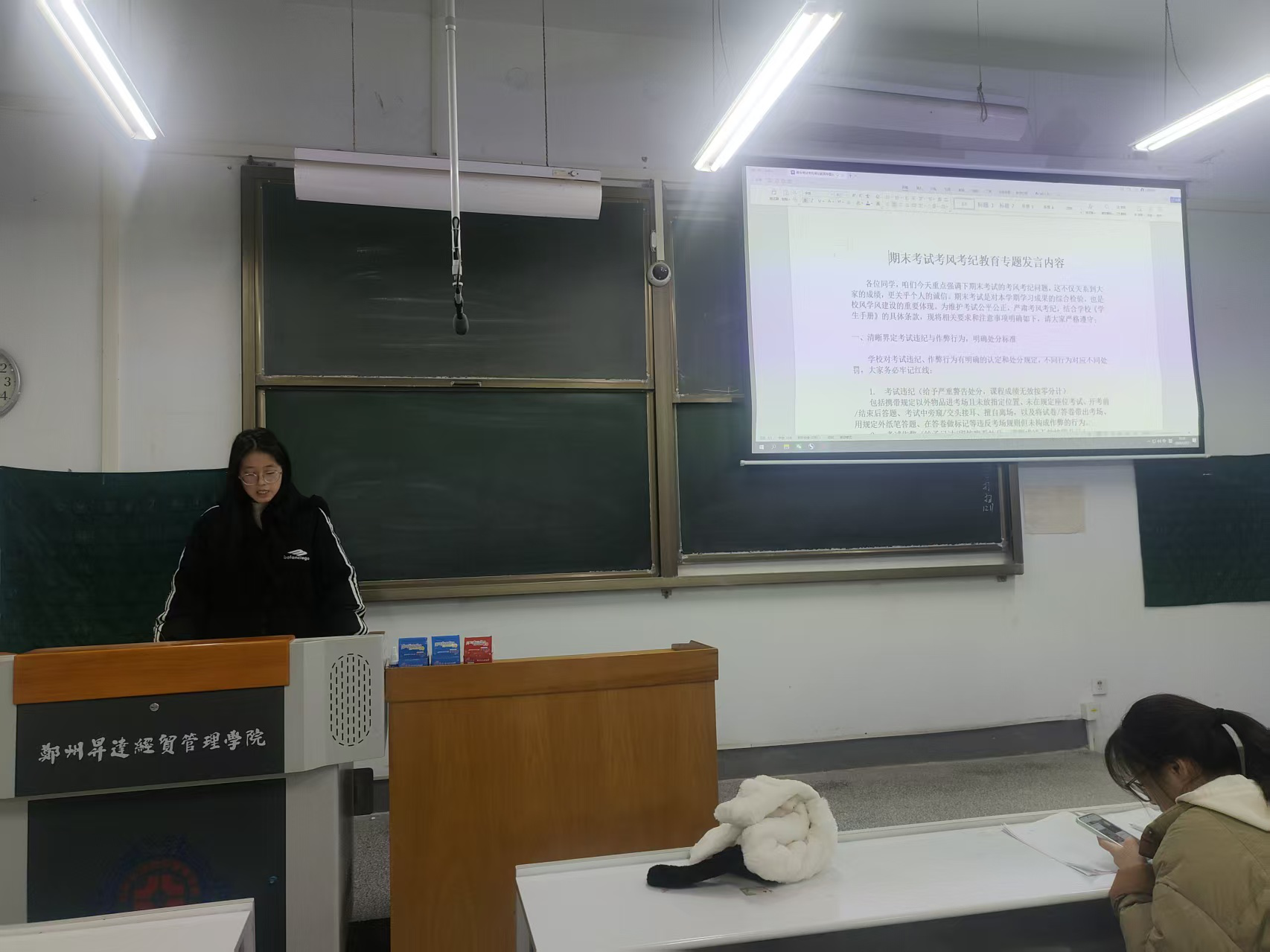 关于期末考风考纪教育专题,结合我校《学生手册》相关规定,重申了考试违纪与作弊行为的认定标准及处分措施,列明携带违规物品、擅自换座等红线,同时呼吁诚信应考,摒弃侥幸心理,以严考风促好学风,做好团学骨干的表率作用。