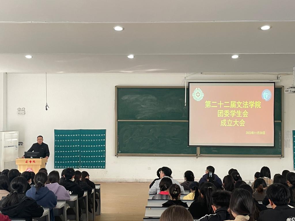 11月20日中午,文法学院第二十二届团委学生会成立大会在教学1号楼118教室隆重举行。参加本次大会的领导和老师有文法学院党委书记刘晓川,文法学院团委书记郑玲玲,2023级新生辅导员吕凌云、李晓田、娄源婷、余雪娇、常伟刚、董思辰。文法学院第二十二届团委学生会全体成员参加了大会,大会由团委学生会主席李亦煊主持。