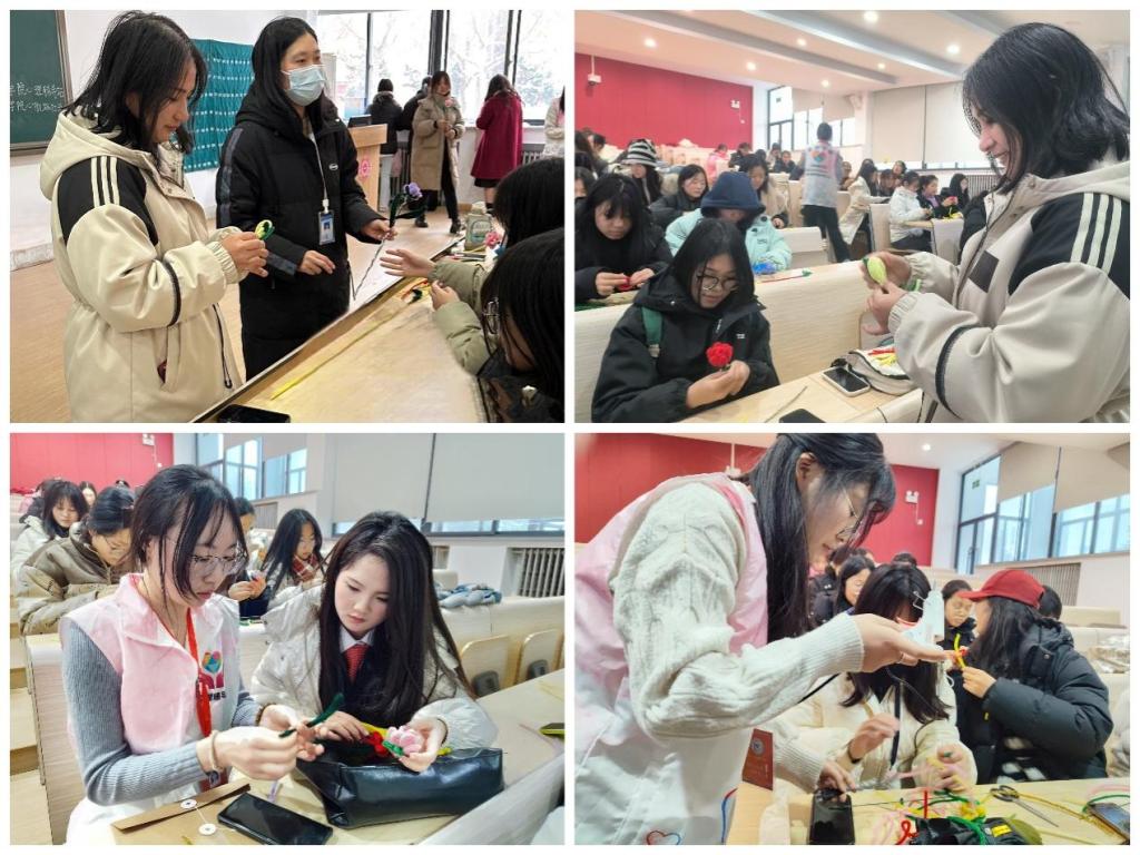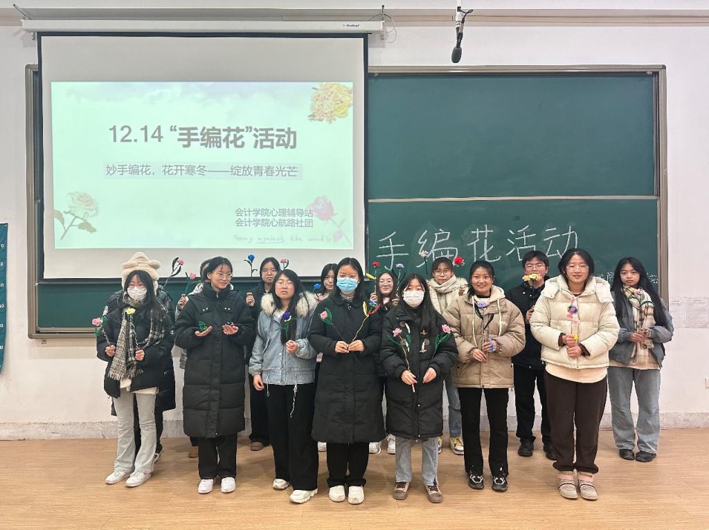 为了活跃校园文化氛围,引导学生更多地关注自身的心理健康,充分展现会计学院学子的风采,会计学院心航路社团于12月14日在教学楼4号楼118教室举办了“手编花”活动。