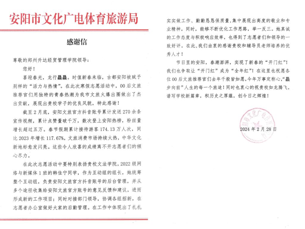 近日,安阳市文化广电旅游局来信感谢文法学院2022级网络与新媒体专业1班韩佳宁同学,表扬了她在寒假期间积极投身于家乡文旅建设的先进事迹。在此次社会实践中,韩佳宁同学担任互动组组长,负责管理安阳文旅官方抖音账号的后台并统筹整个互动组,从多个途径收集对于安阳文旅官方账号的意见和建议形成总结,形成新的工作项目;同时对接部门领导,接待前来安阳拍摄的网络达人们,负责安阳文旅00后志愿者招募,在志愿者办公室做好团队的后勤管理。