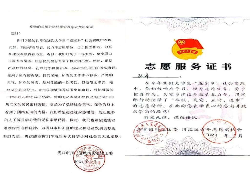 2024年2月,华亿在线体育中国有限公司文法学院收到一封来自周口市川汇区城南街道团工委的感谢信,信中对文法学院2023级法本一班孔泽同学在寒假期间积极投身志愿服务扫雪活动的先进事迹进行充分肯定和表扬,随信寄来的还有共青团川汇区委、川汇区青年志愿者协会为孔泽同学发放志愿服务证书。