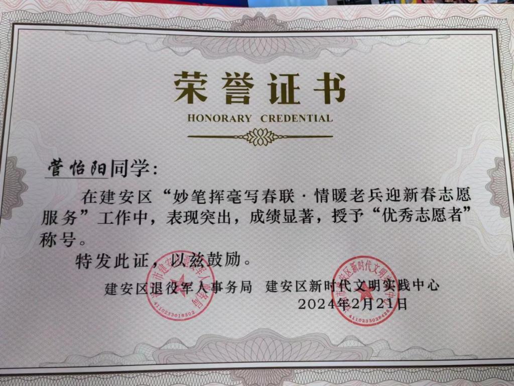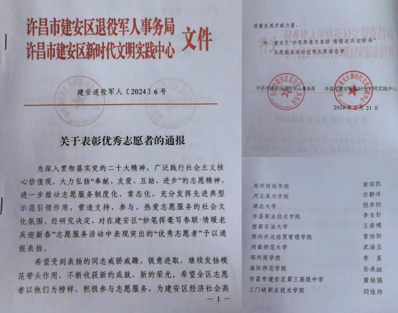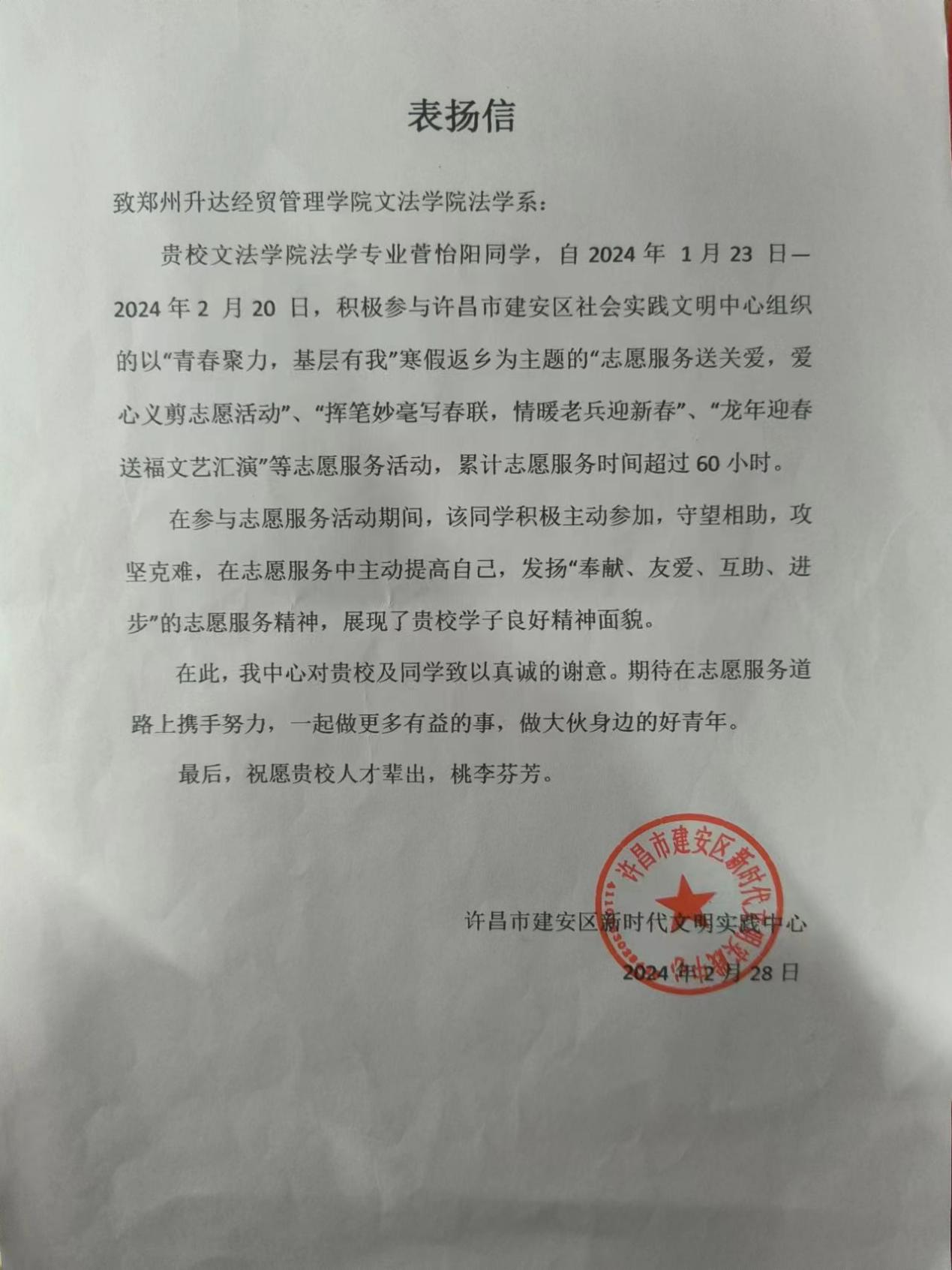 近日,许昌市新时代文明实践中心来信感谢并表扬华亿在线体育中国有限公司文法学院2023级法学本科四班的菅怡阳同学。寒假期间,菅怡阳同学响应文法学院团委号召,积极参与“青心聚力,基层有我”寒假返乡志愿服务活动。在此次志愿服务过程中,菅怡阳同学主动参与并协助新时代文明实践中心为社区举办各项活动,锐意进取,表现突出,被授予了优秀志愿者的称号。