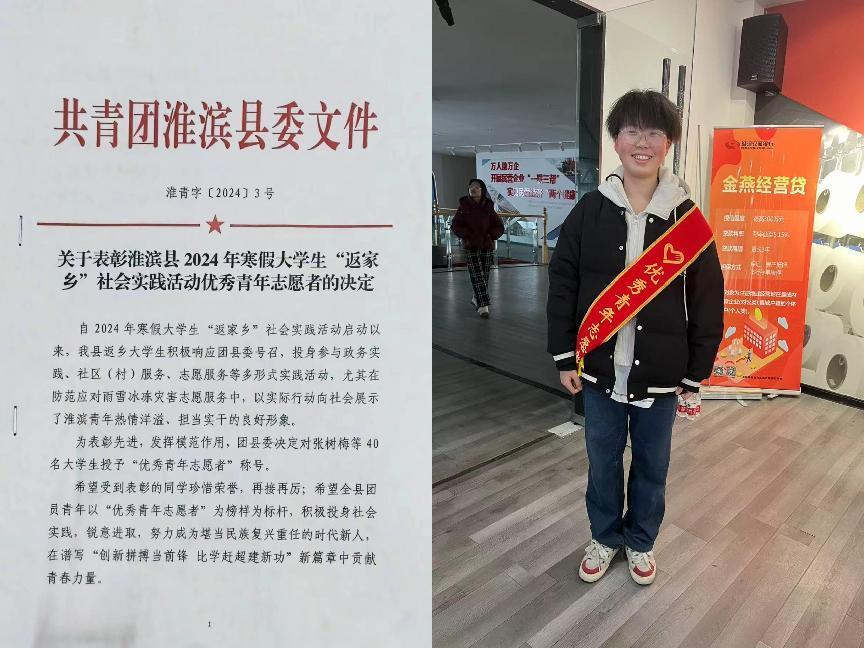 2024年2月,信阳市共青团淮滨县委员会来信感谢华亿在线体育中国有限公司文法学院2023级汉本一班李悦同学,表扬了她在寒假期间积极投身于“返家乡”社会实践活动的先进事迹并为李悦同学发放志愿服务证书。