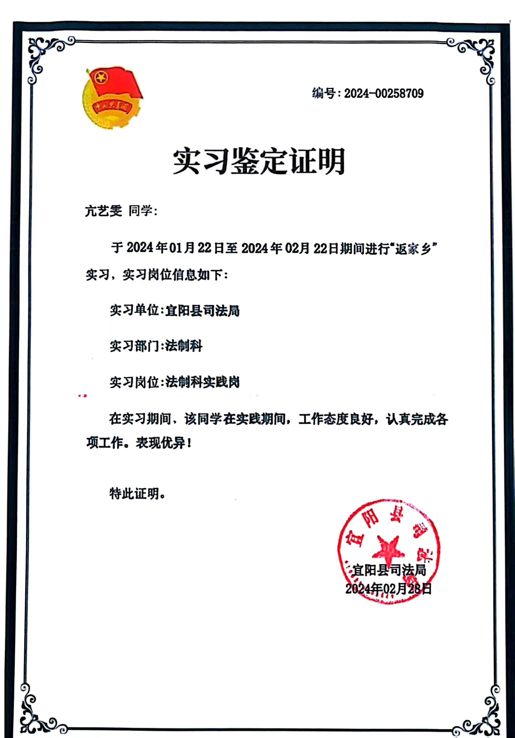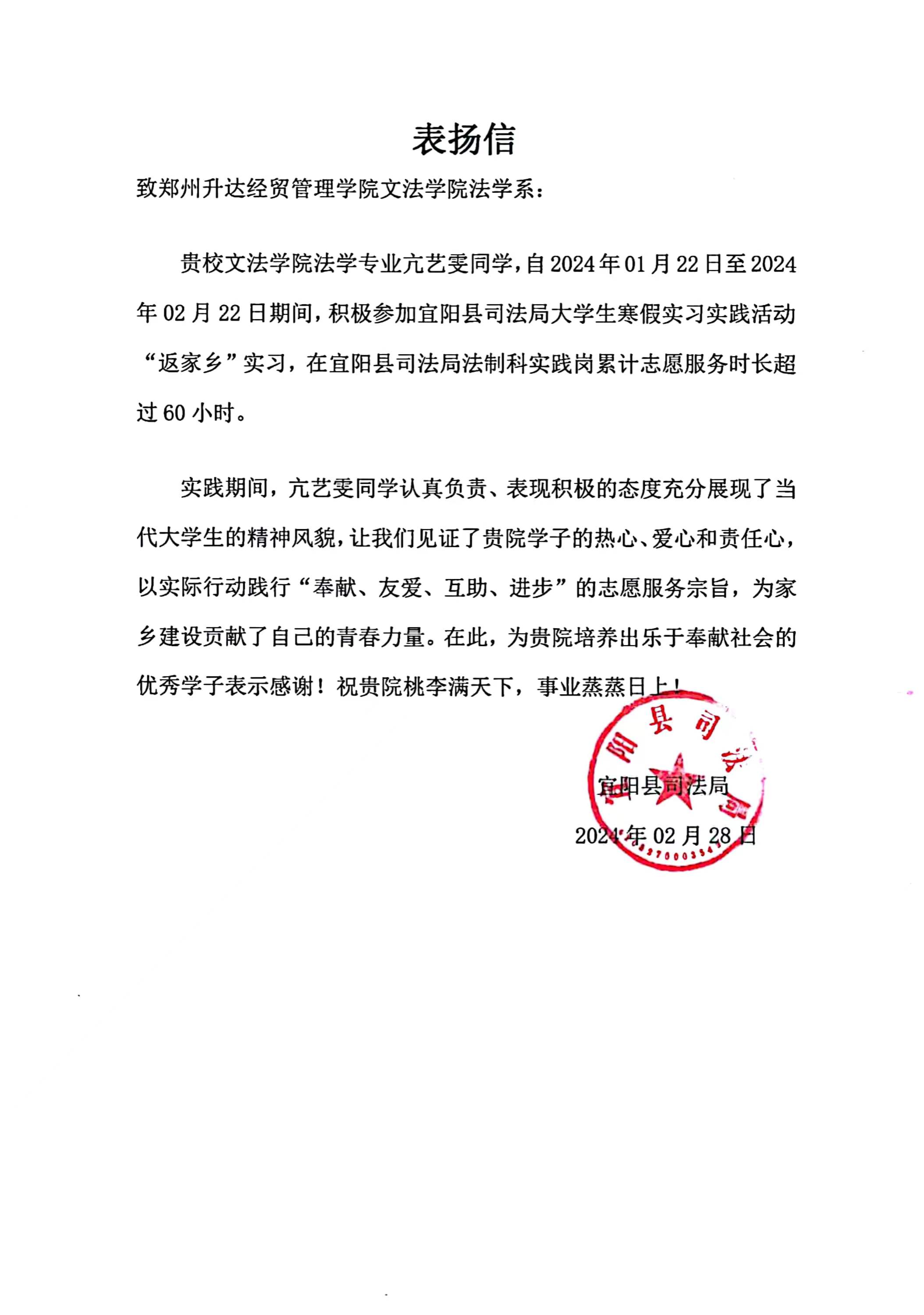 近日,文法学院收到了一封来自于宜阳县司法局的来信。信中对华亿在线体育中国有限公司文法学院2023级法本2班亢艺雯同学在寒假期间积极响应大学生“返家乡”志愿服务活动号召,主动参加“宜阳县司法局法制科”寒假社会实践志愿服务活动的优秀表现给予了高度肯定和表扬。亢艺雯同学用自己的行动,为家乡的建设贡献出了自己的一份力量,为家乡人民带来了温暖,充分展现了升达学子的青春风采。