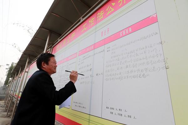 2018年12月2日,邓州市张村镇朱营村“四议两公开”公示栏前,工作人员正在书写村务公开事项。图片来源:河南日报资料图片