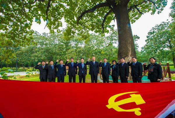 2017年10月11日,中共兰考县委常委一班人在“焦桐”树下重温入党誓词,缅怀焦裕禄精神。图片来源:河南日报资料照片