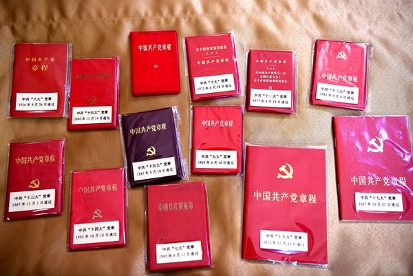 中国共产党第十九次全国代表大会会议期间,“网红书记” 薛荣党代表带来自己多年收藏的党章,在驻地房间里办起了“党章”展。从七大到十八大,12本鲜艳的党章闪耀着光芒,“党章展“吸引参会代表观看。图片来源:河南日报资料图片