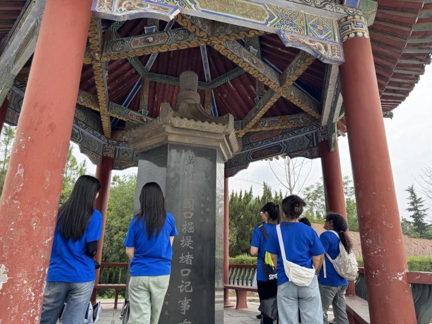 最后,团队抵达花园口景点。这里承载着不容忘却的沉重历史。同学们神情肃穆,缓步来到“黄河花园口掘堤堵口记事碑”前,石碑默默伫立,似在诉说往昔苦难。团队负责人语调沉重地讲述历史脉络,同学们屏气聆听。听闻当年黄河决堤给百姓带来无尽灾难,不少人眼眶泛红。此刻,大家深刻领悟到黄河治理对守护人民幸福的重要性,参与黄河生态保护的信念愈发坚定。