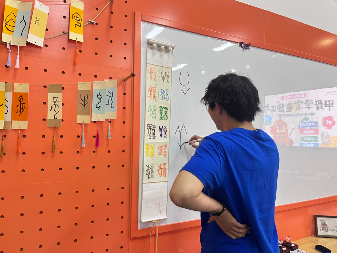 活动接近尾声时,实践团成员来到展馆互动区,主动化身“小小讲解员”,热情地向参观的游客介绍甲骨文相关知识,还手把手教大家书写简单的甲骨文字。一位参与体验的小朋友兴奋地说:“原来汉字这么有趣,像画画一样!”成员们用青春活力架起文化传播的桥梁,让更多人感受到古老文字的魅力。