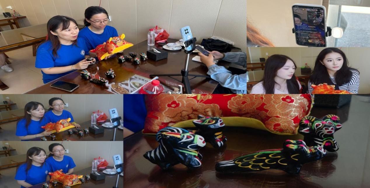 活动当天,实践团成员身着统一服装,在周口淮阳特色文化街区搭建直播场景,以中英双语向观众介绍周口的历史文化底蕴。直播中,成员们详细讲解泥泥狗与布老虎的起源、工艺特色及文化内涵:泥泥狗造型融合神话元素,色彩彰显原始艺术魅力,是淮阳传承千年的民俗信物。为增强直播互动性,团队设置非遗知识问答环节,观众通过弹幕参与答题,答对者可获得泥泥狗文创。