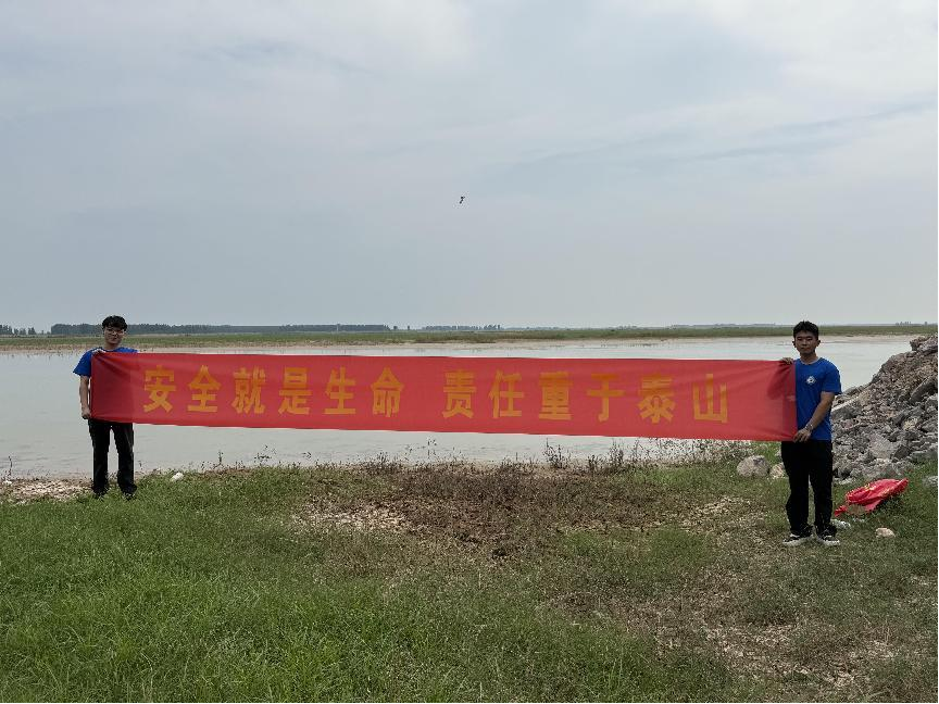 黄河滋养大地,却也潜藏安全隐患。实践团深知守护生命的重要性,在岸边拉起“安全就是生命 责任重于泰山” 的横幅。红色标语在绿野黄河的映衬下格外醒目,传递着强烈的安全警示。