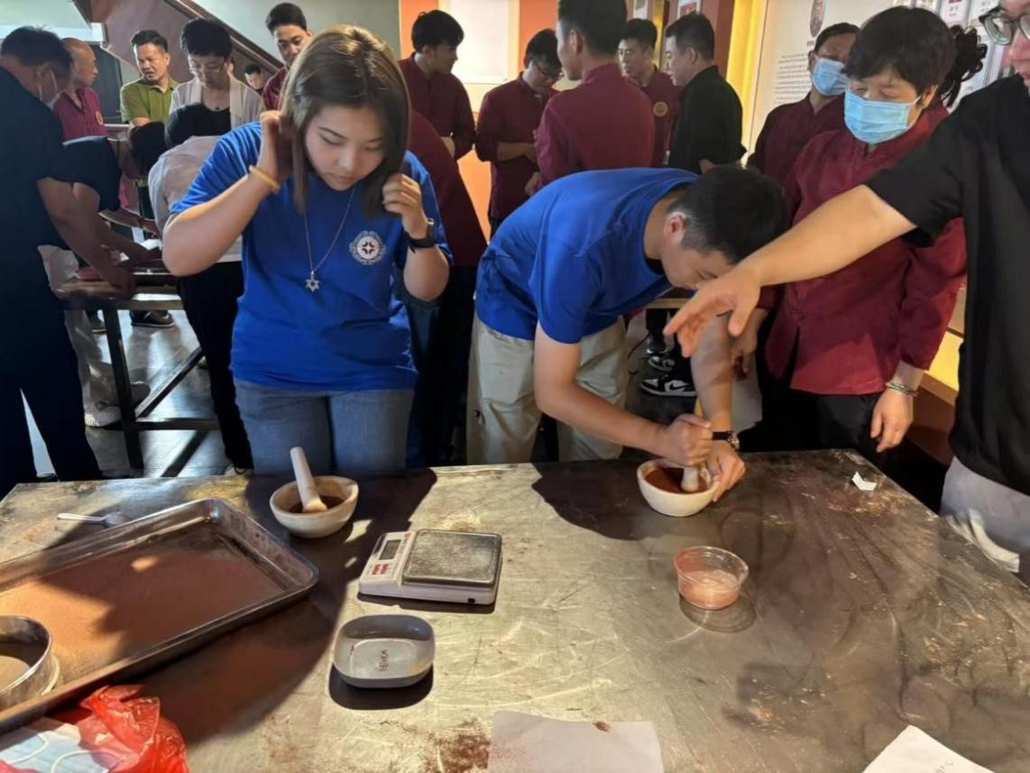 随后,团队深入青山药业有限公司,国家级非物质文化遗产项目禹州中药炮制技艺传承人朱义中热情接待了师生们。在炮制工坊,朱义中老师强调:“这锅里的温度差一点,药效可能就天差地别。”在他的指导下,同学们站上炒药台,亲身体验对炒药火候的精妙把控,感受药铲翻飞间的节奏与力道。随后又使用石臼将药材反复研磨、过筛,指尖传来的细微震动与弥漫的浓郁药香,让同学们切身感受到了“炮制虽繁必不敢省人工”的古训。