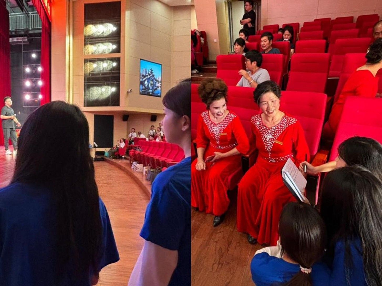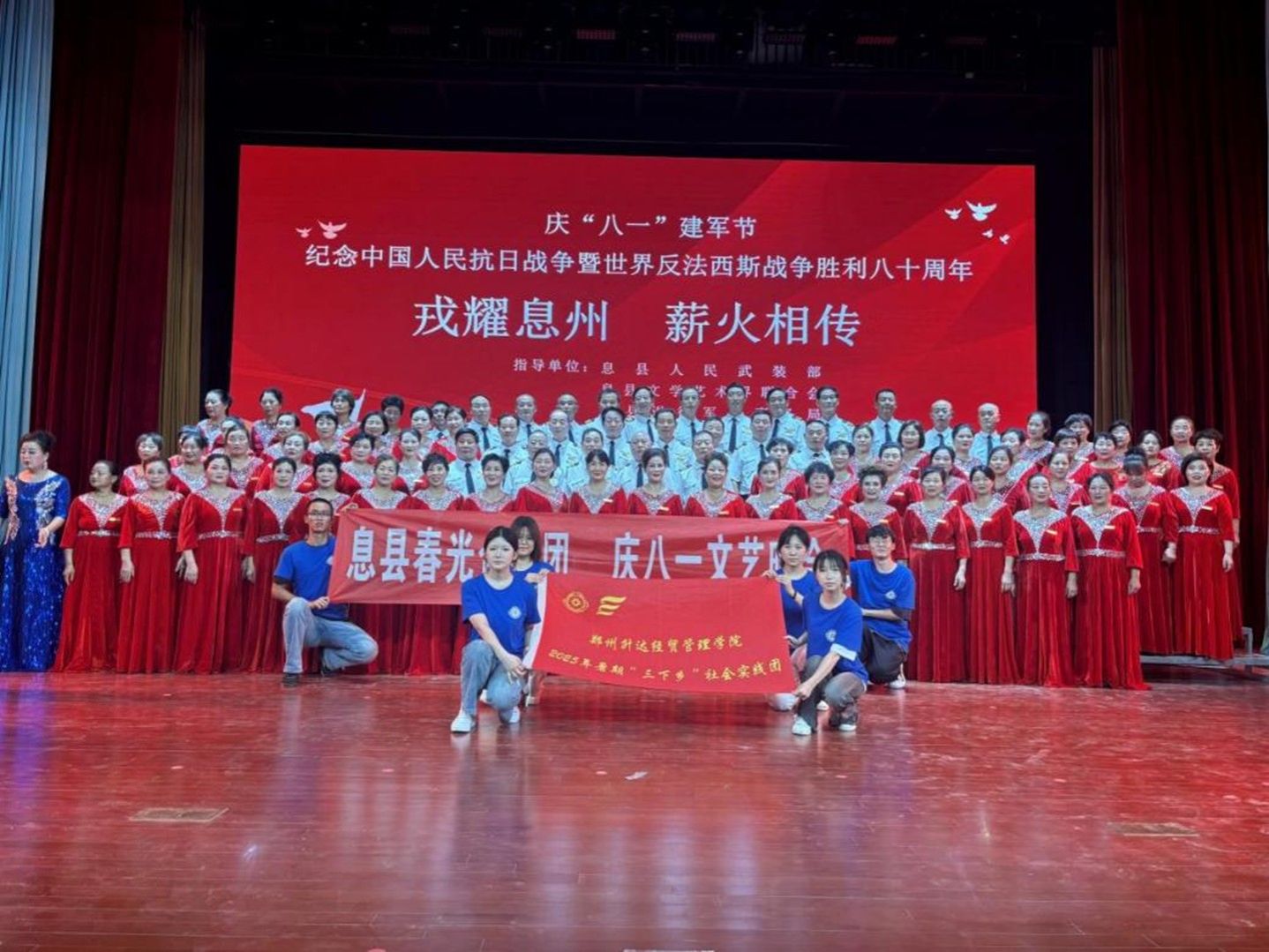 为进一步助力传统文化传播,团队联系当地春光合唱团团长,深度参与 “戎耀息州 薪火相传” 系列文艺活动。活动当日上午,志愿者赴现场协同确认彩排流程,核对节目站位、音乐衔接与灯光配合,同时与合唱团奶奶们交流,倾听她们退休后以歌声传承红色文化与民俗的初心;夜幕降临,志愿者分工引导观众、协助演员候场,保障活动顺利开展。演出后,双方合影留念,奶奶们感慨 “年轻人有活力,文化才能传得远”。此次参与,让志愿者深刻感悟到 “传承” 不仅是技艺传递,更是跨代际的精神接力。