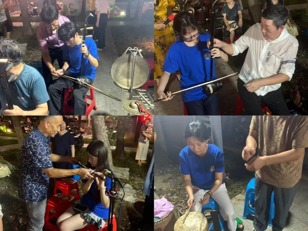 随后,志愿服务团联系春风戏曲团,在当地政府广场联合开展戏曲展演与交流活动。活动当天,志愿者们早早到场,协助艺术家们调试乐器、整理戏服,做好演出前的各项准备工作。演出过程中,大家沉浸观赏经典剧目,感受梆子声里的戏曲韵味;演出间隙,志愿者们围在艺术家身边虚心求教,从二胡的握弓姿势、笛子的运气技巧,到戏曲唱腔的换气方法,在一遍遍亲手练习中,切实体会戏曲器乐与表演的精妙。